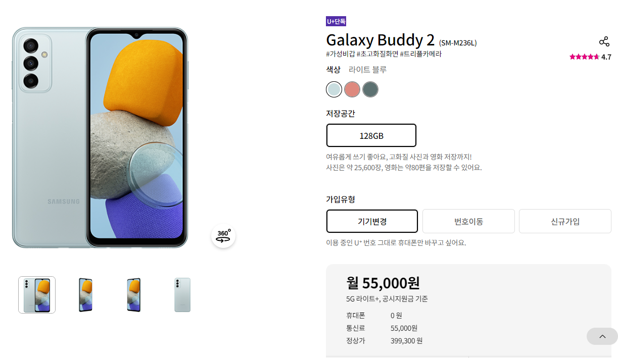 갤럭시 버디2는 2022년 3월에 출시된 LG U+ 전용 모델입니다. 출고가는 399,300원이지만, 휴대폰 성지를 이용하면 0원에 구매할 수도 있습니다. 보급형 저가폰이지만 스펙으로 보면 일반 플래그십 중저가폰에 밀리지 않습니다.