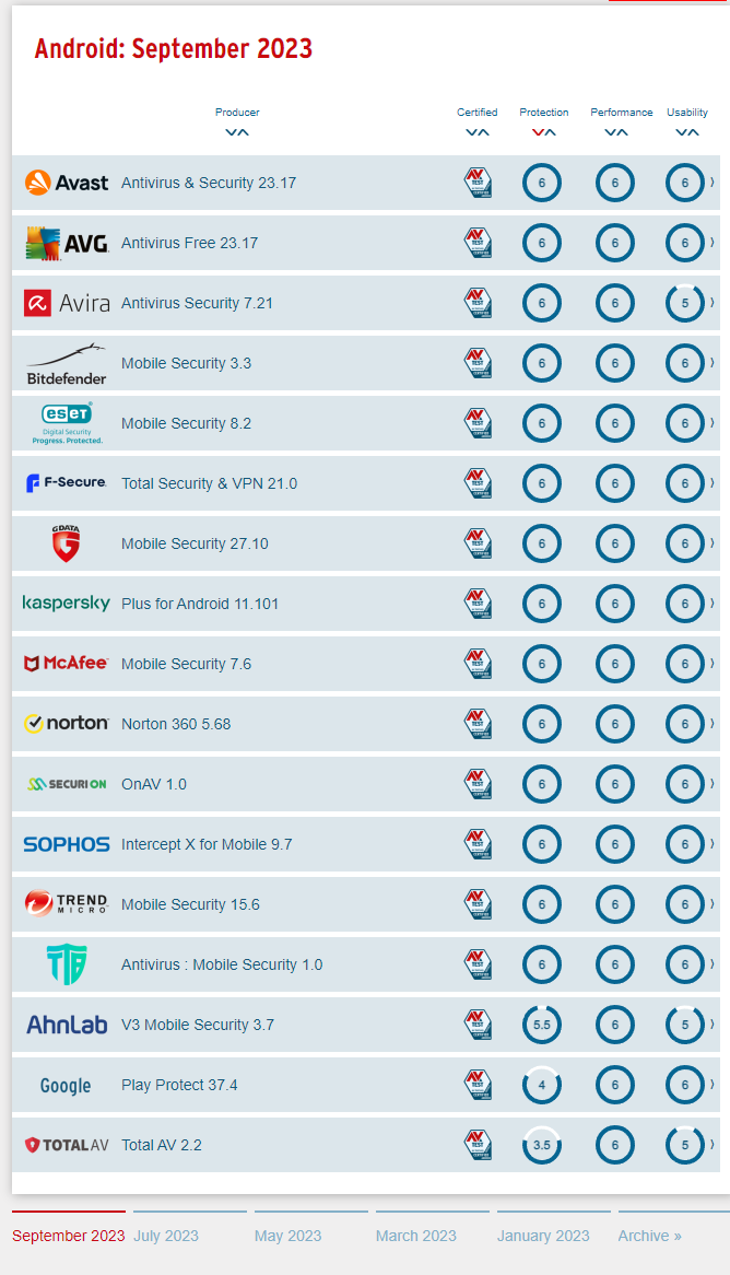 The current tests of antivirus software for Android from September 2023 of AV-TEST, the leading international and independent service provider for antivirus software and malware.