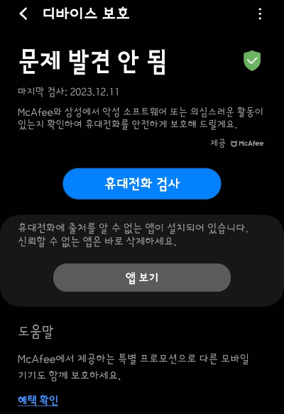 다른 하나는 스마트폰 제조사에서 2. 기본으로 제공하는 바이러스 검사 기능을 사용하는 방법입니다. 삼성 갤럭시 스마트폰의 경우, 기본 내장된 디바이스 케어 앱을 통해 바이러스 검사를 할 수 있습니다. 2023년 현재 갤럭시와 McAfee(맥아피)는 9년간 장기 파트너십 계약을 체결 한 상태(아래 기사 참조)라서 갤럭시 라인업의 기본 보안 프로그램이 당분간 바뀔 여지는 없습니다.