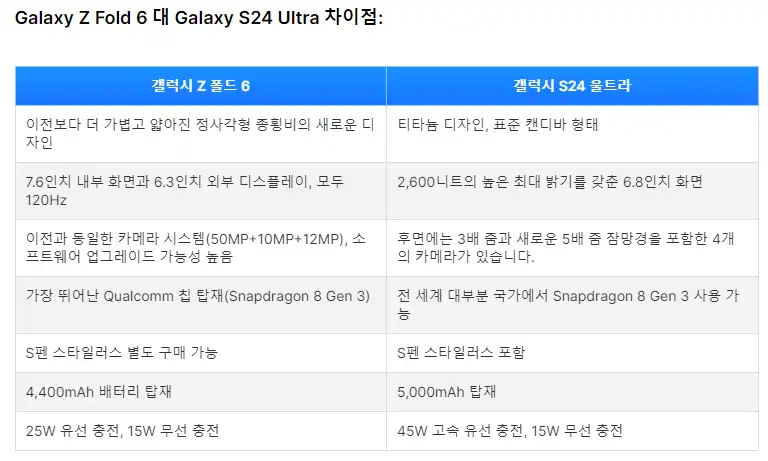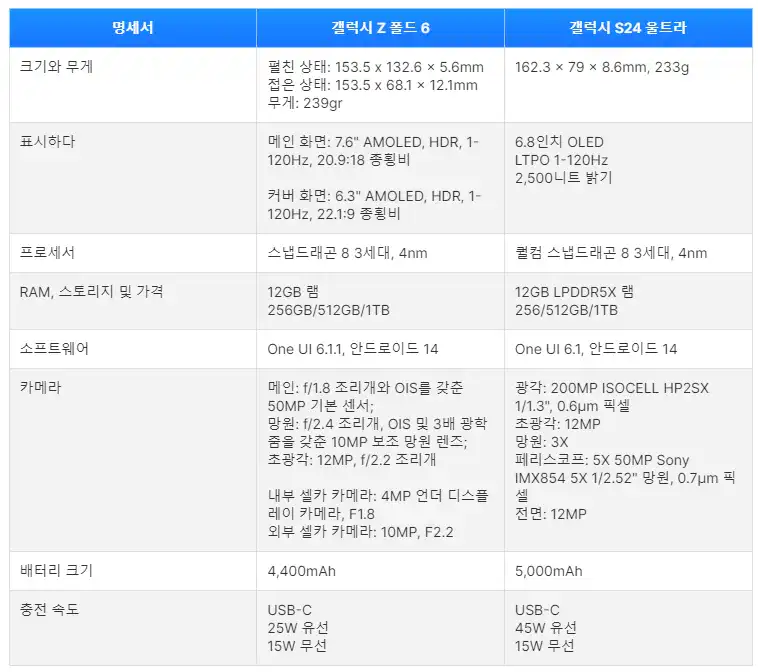 | 항목 | 갤럭시 Z 폴드 6 | 갤럭시 S24 울트라 |